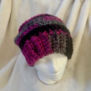 New beanie, handmade crochet, slightly slouchy, with chunky yarn. Nice and soft in shades of pink, black, grey. Easy care. Mach wash/dry low heat.