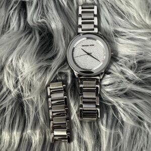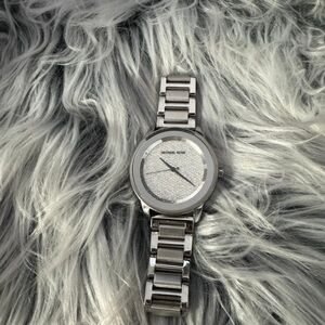 This Michael Kors ladies watch features a silver stainless steel band, with a silver crystal dial, this is offset with stainless steel casing. A stylish and elegant timepiece that is ideal for all occasions. Stainless Steel Silver Band Silver Crystal Dial Push-button Deployment Clasp Quartz Movement Scratch Resistant Mineral Crystal Water Resistant to 10ATM (100m)