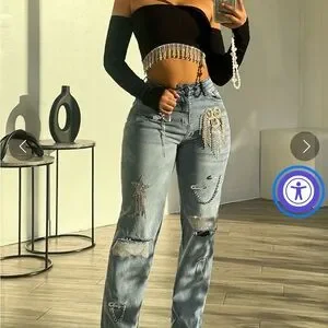 Stylish blue jeans with eye-catching embellishments. Perfect for adding a touch of flair to your outfit.