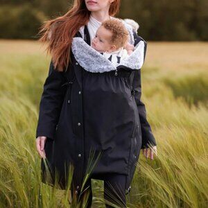 The style evolves after baby is born to work beautifully with your baby sling - simply zip on the extra panel at the front to keep you and baby cozy! Also lined in soft faux-fur, the babywearing insert features a section for baby’s feet, and can be worn open or zipped all the way up to protect baby from the elements.