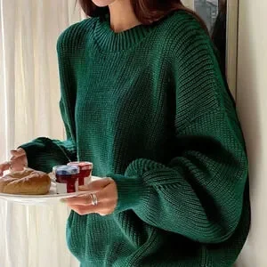 Green Boho Womens Eyelet Detail Ribbed Knit Drop Shoulder Sweater