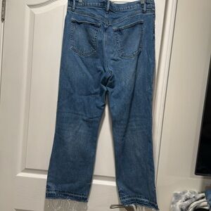 Purchased distressed. Barely worn. Straight leg ankle length.