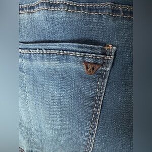 Crotch to leg measurement; approximately 25”. Waist measurement; approximately 17.5”. Button fly zip. Elasticized waist band for a slimming fit. Slim additional pocket on right side. Signature W&W raised W on back pocket.