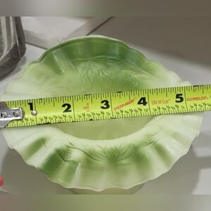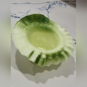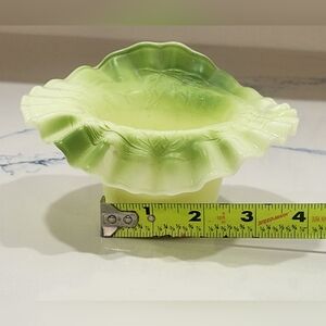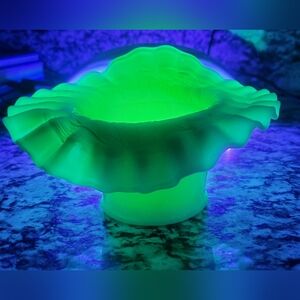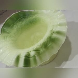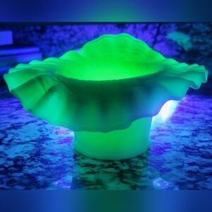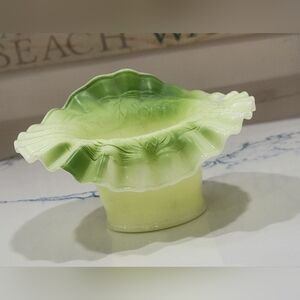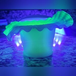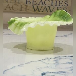 Antique Fenton Blackberry Spray, Green over Custard, 1915 ruffled Hat Vase. Made from Uranium Glass, and features include a ruffled edge that resembles a hat or a flower.
