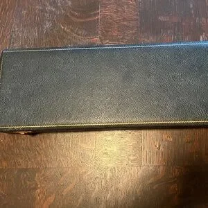 This Sanderson cutlery set includes a knife, fork, honing rod, and case, all crafted from high-quality materials. The antler, stainless steel, and Sterling Silver components ensure durability and elegance. Perfect for any kitchen or dining set, this set is a must-have for any collector or host. NOTE: Case has minor scratches & dings.