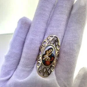 Design: Features a stunning Madonna and Child emblem encased in an elegant openwork design with intricate circle details surrounding the image.