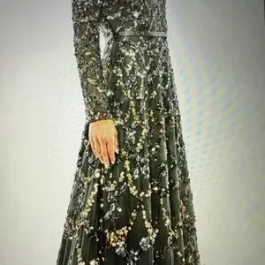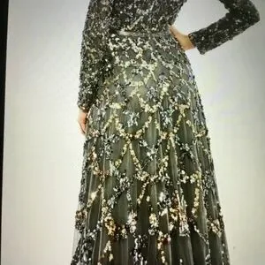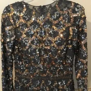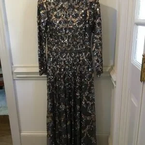 Gorgeous A-line gown illuminated with glittering sequins and light-catching beads. Cleaned and in excellent condition. Only worn once for a couple of hours and received so many compliments. Tags included (not attached) and extra beads in bag. This dress is so flattering and elegant. I’m 5’4 and wore 2 inch heals.