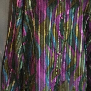 Selling a NWT Vintage 80’s Women blouse size large from the O’Keif and O’Keif Collection. Blouse is a two layer top outer layer of blouse is sheer with fun colors of purple,green , blue and gold. Inside blouse is a attached black tank top. Length of blouse 25”, arm length 23.5” and width of shirt 21”. Item is in excellent condition never worn.