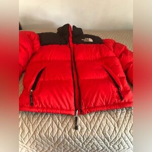Mens north face nuptse jacket in red/black. Original design. Features: 700 down fill, adjustable hood with drawstrings concealed in collar, drawstrings at waist to tighten, front zipper pockets, interior storage pocket. Jacket stows in front pocket that doubles as stuff sack, adjustable Velcro cuffs. Couple minor flaws- black coming into contact with red nylon, small hole covered with tape-see photo. Measurements pit to pit 23 inches, shoulder to waist length 26.5 inches sleeve length 27 inches