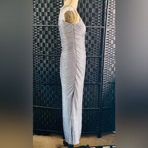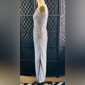 Laundry by Shelli Segal Los Angeles, Size 4 one Shoulder, Stretch silver metallic fabric dress with side seam rhinestone panel at wearers left side from armhole end to hip
