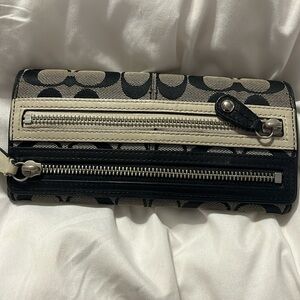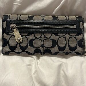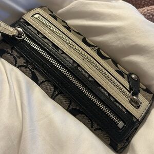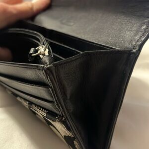 Coach wallet with 10 credit card slots, one zipped inside slot, 3 open slots for bills, papers etc … leather interior, “c” fabric on the outside with zippers for decor (do not open) …. Snap front closure and nice opening for easy access …Great condition …