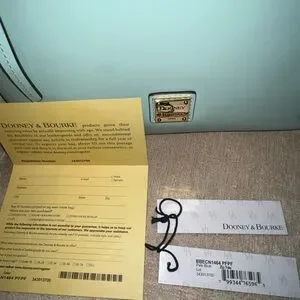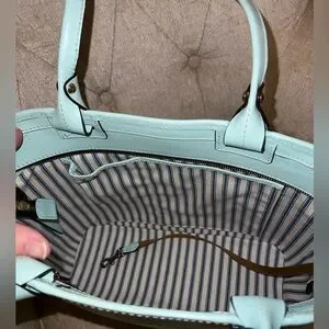 Like new Dooney & Bourke Beacon style zip tote. This is my personal bag carried very little as I discovered I am a crossbody girl. Beautiful pale blue leather. Left front corner shows a slight indentation in some pictures, possibly from me not restuffing that corner enough and storing standing. There appears to be a small amount of dimpling at front edge, see pictures. Overall great condition.
