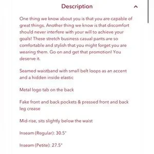 This brand makes THE most comfortable business attire. This particular design features a stretchy tummy-control waistband and does not have a zipper or button closure, it is pull-on like leggings and just as comfortable.