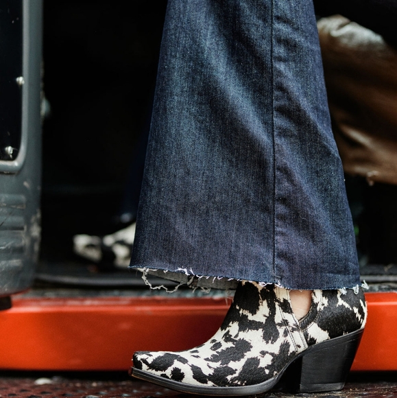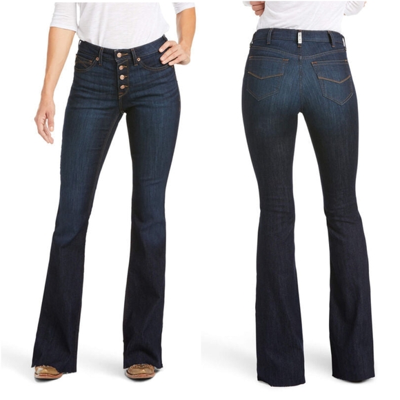 Womens Ariat Ophelia High Rise Flare Jeans in Nashville sz 32 R. Excellent condition, worn once. These jeans have a gorgeous dark wash with a raw cut hem and flare leg, as well as a button fly. Waist flat is 16.5", rise is 11.5", inseam is 33". (As they have a raw hem, they can be altered or cut to your needed length if you desire). Retail $89. Ships immediately from smoke-free home. More denim also listed from Buckle, BKE, Judy Blue and American Eagle if you want to bundle
