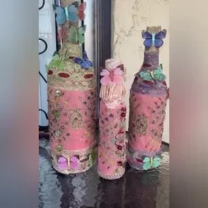 The Butterfly Garden Gypsy Bottle Set” 🥰💜🌸🪻🦋🌹🌻🎍🌿🌱🪴🍃🍶3 bottles, Handcrafted by me, Priscilla, of Priscilla’s Mystical Treasures, using regular and glitter paints(nontoxic) and couple layers of gloss finish;embellished with lace with ribbon trimmings, overlay of silk fabric pieces, and chiffon fabric pieces as well; highlighted by rhinestones; glue gun usage; made with passion, joy, and tranquility in mind.