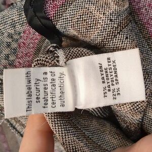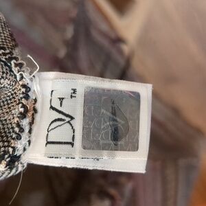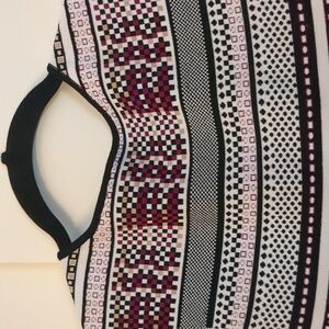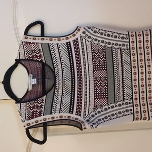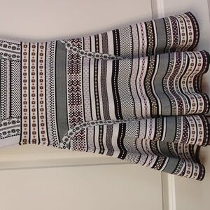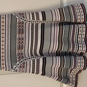 beautiful knit dress pattern squares and circles in a purple, brown, black and white pattern. This does flare out and is a very heavy dress. perfect for winter paired with a jacket or sweater. in good condition no stains, rips or tears noted. is 16 in approximately 13 in. keep in mind this does stretch. please review pics and ask questions prior to purchase
