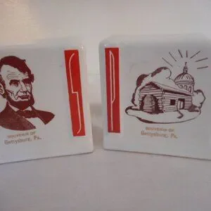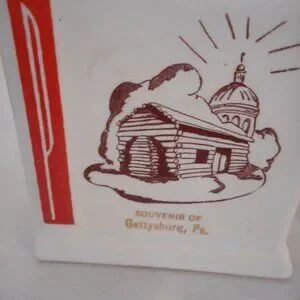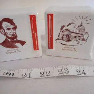 Gettysburg souvenir features gold text with Abraham lincoln on one shaker and log cabin on the other