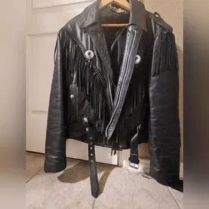 Biker type leather jacket with fringes . Great for those motorcycle rides.