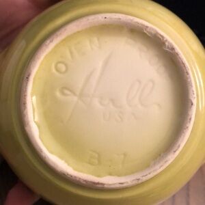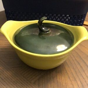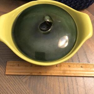 Vintage 1950's Hull Crescent B-7 pattern individual casserole with lid. Ovenproof. Made in USA. Approx. 5 by 6 1/2" by 4" high (to top of lid finial). Casserole is chartreuse green with the lid being a contrasting dark green color. Very good vintage condition. A small mark on the handle. Please see photos for details and approx measurements .