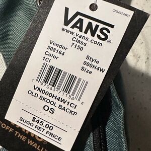 Brand new and sold out in this beautiful forest green. The Old Skool Backpack is a favorite for good reason. This classic backpack features an all-purpose, two pocket design with an organizer in the front, a slip-in interior pocket, laptop sleeve that fits most 15'' laptops, and a side water bottle pocket. A dark green hue and historic details like the classic Vans® label bring added personality to this iconic design.