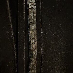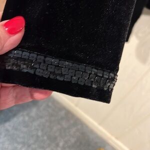 Velvet sequins around shell neckline and around the neckline and down along the jacket.