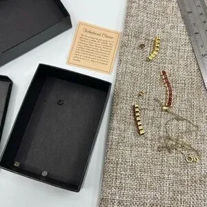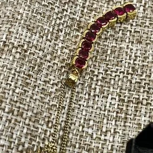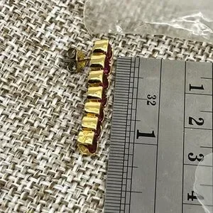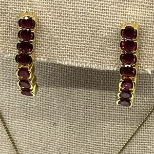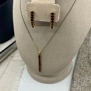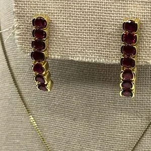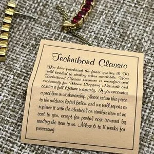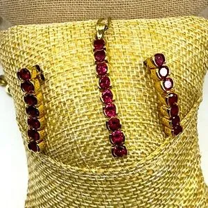 This exquisite Technibond Classic set, likely from HSN in the early 2000s, features a stunning combination of 18K gold bonded to sterling silver and vibrant ruby-colored stones. Known for its timeless elegance and quality craftsmanship, this set includes a 16-inch necklace and matching 1.25-inch stud earrings, offering a coordinated, luxurious look.
