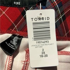 Plaid pixie pant, brand new. Front pockets, back faux pockets. Wide non roll waist band. Super soft and stretchy. Rayon, nylon and spandex. I usually wore a 20 from Torrid. These are 18/20 and they were too small for me. These would better fit a 16/18 in my opinion. 19 in across waist, 10 1/2 in rise, 27 in inseam. Plaid red, blue, gray, black and white.