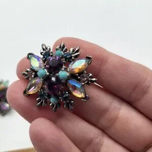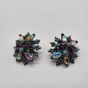 VTG Cluster AB and Pink/Purple Rhinestones Clip On Earrings Blue Accent Beads