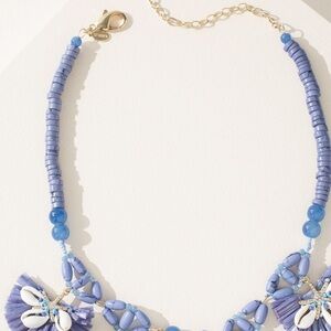 Chico’s Periwinkle Shell Bib Necklace with five beautiful pendants. Brand new with tags. The dimensions are 18.5” in length with a 4” extender, lobster clasp for a secure hold. Necklaces is lightweight with faux shell accents on a raffia background. The color is outstanding and has a bohemian, natural beach design in mind. Ships from a smoke free environment. Handcrafted with nickel free metal. Only one in stock.