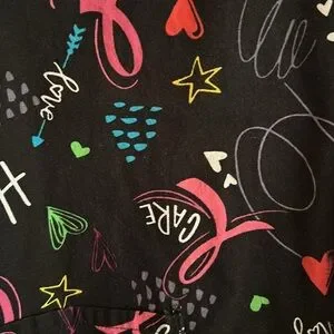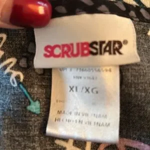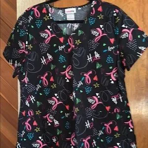 Scrub top measures 24” pit to pit and 26” shoulder to hem.