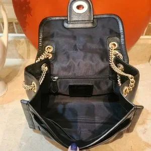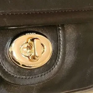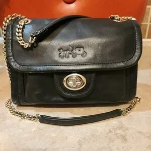 Stunning Black soft leather Coach with gold chain link and leather strap, can be used as shoulder, crossbody or arm purse. Excellent condition like New. Beautiful gold turnlock on front opens to one front pocket with zipper on the inside and 2 side pockets. Back pocket has magnetic closure. Corners are excellent along with the chain and handles, Beautiful classy bag with carriage horse above turnlock. 9.5W x 8L... Handles 9.5 in drop.....one strap for crossbody wear aprox 19 long.