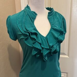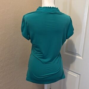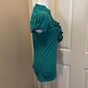 This pretty teal green pullover top has good stretch with front ruffle and cinched sides. 17 inches pit to pit 26 inches length. Medium. CC