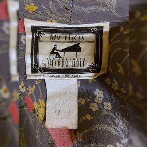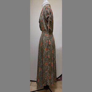 Vintage Sherry Holt 1940s revival style grey floral rayon crepe tea length dress from the 80s with smocked shoulders and waist and split cap sleeves with ties.