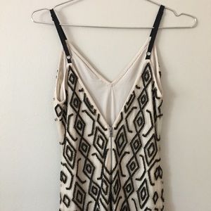 Fitted close to the figure to ensure a flattering silhouette, the Arlette dress is cut with a centre slit to grab attention from the very first step. Cream white silky mesh with black and gold-tone tribal bead embellishment, with a V-neck and plunge back Black adjustable petersham ribbon straps All over beading Sheath silhouette Straight hem Back zip closure Lined Shell: 100% nylon; Lining: 95% Polyester, 5% Elastane