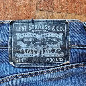 Levi's 511 Straight Leg Jeans Size 30 x 32. Slight wear and tear in the rear (see pictures). A great casual pair for gardening, mowing the lawn, and other casual activities.
