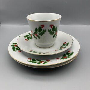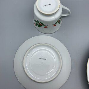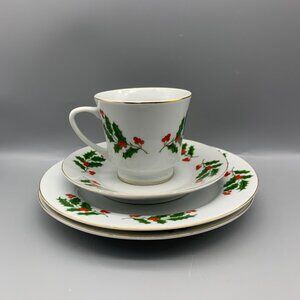 Set of White with Green Holly and Red Berries Cup & Saucer and 2 Dessert Plates