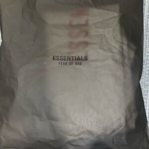 A classic crew neck t-shirt in light gray featuring 'FEAR OF GOD ESSENTIALS' text in reddish-orange color, made of soft cotton-like material. Never been worn. SHIRT RUNS LARGER. Never Worn. Original Packaging as well. Flexible with prices so hmu with best offers ‼️🔥