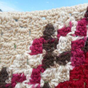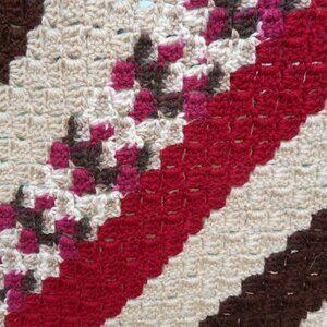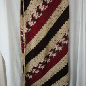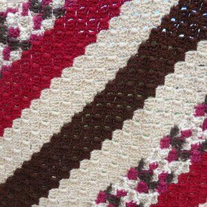 Very pretty tan/beige/brown/dark raspberry crocheted lap throw afghan