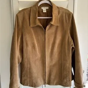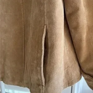 Like new. Very good condition. Tan suede leather material. Pockets on side of jacket. No marks or tears or stains. Non smoking & pet free home.