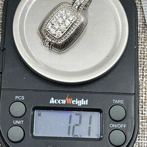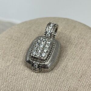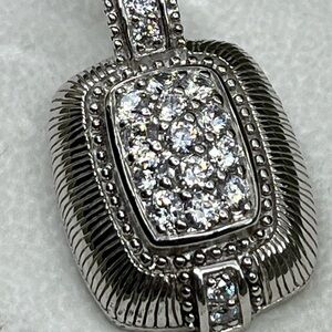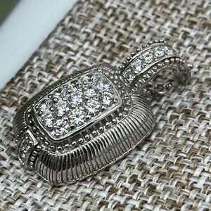 This stunning Judith Ripka Sterling Silver Enhancer Pendant features sparkling CZ stones in a beautifully detailed sterling silver design, showcasing the brand's signature craftsmanship. Well kept for over 20+ years and never worn. Original certificate and box!