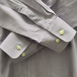 Tight checks mark a fine dress shirt crafted from thicker, high-quality cotton and fitted with a wide spread collar and rounded, adjustable button cuffs.