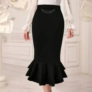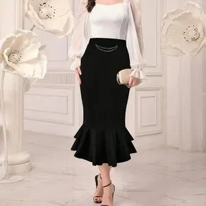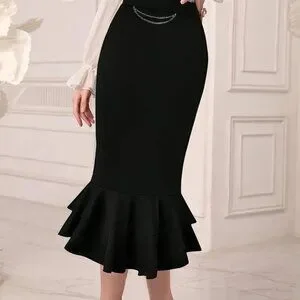 Slimming Waist Elegant Mermaid Tail Midi Skirt -, Versatile in Black with Metal Chain Detail, Machine Washable