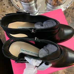 A mirrored block heel supports this leather round toe bootie while dual cross strap and buckle detail add the perfecting finishing touches.
