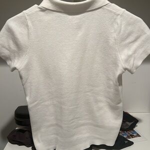 A crisp white polo-style crop top with short sleeves and a slim fit, perfect for a casual summer look.
