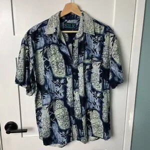 Mens Retro 90s Silk Patterned Blue Button Down Short Sleeve Shirt