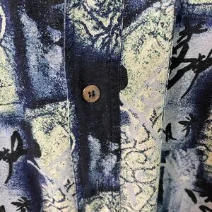 Mens 90s vintage silk patterned shirt with hand-drawn, sketch-look images of sun and other nature themes. Groovy!