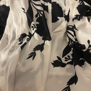 This black and white blouse features a bold floral pattern, a button-up style, and a relaxed fit.