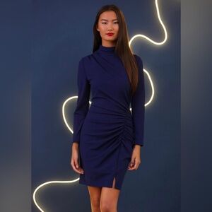 Turtle neck, ruching at right shoulder seam, long sleeves, ruching along curved side front hip seam, and an above the knee length dress with a side front mini slit at hem.