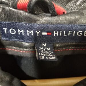 Elevate your style with this vintage Tommy Hilfiger leather jacket, perfect for both casual and business occasions. The mid-length heavy pea coat design features a solid black pattern and classic fit, with a button closure and lined interior. The jacket is made of high-quality leather and has a chest size of 44 inches, making it a great choice for men who value both style and functionality. This jacket is a true designer piece, with Italian and USA influences, and is perfect for any 90s fashion enthusiast. The jacket is a regular fit and is available in size M. It's a great choice for anyone who wants to add a classic, timeless piece to their wardrobe.