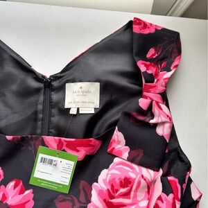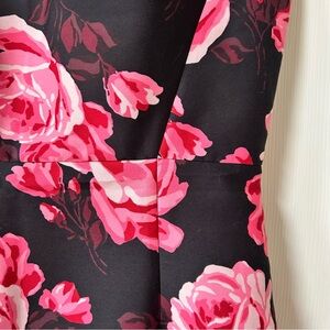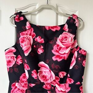 Elegant Kate Spade sleeveless dress featuring a vibrant pink floral pattern on a classic black background. Beautiful bow detail on both shoulders. V neck back with back zip. Fully lined. Perfect for as a wedding guest dress, holiday party or other special occasion. New with tags!